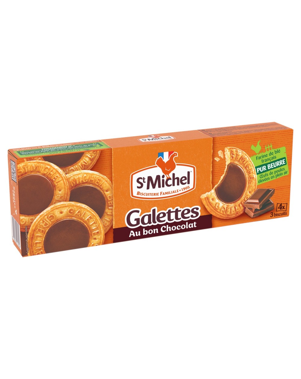 Retrouvez le croustillant de la traditionnelle galette St Michel, avec un cœur au chocolat croquant! Nous perpétuons le goût des bons produits, car les meilleurs ingrédients font les meilleures recettes. Nous utilisons exclusivement des oeufs de poules élevées en plein air, notre farine est exclusivement faite à partir de blé français et nous n'utilisons pas d'huile de palme dans nos recettes. Nous fabriquons ces galettes au chocolat dans notre biscuiterie familiale à Avranches, en Normandie.